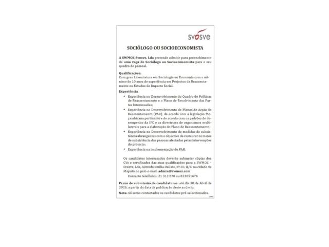 Vaga – Sociólogo ou Socioeconomista