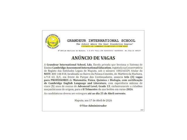 Vagas para professores das áreas de Matemática, Física, Química e Biologia