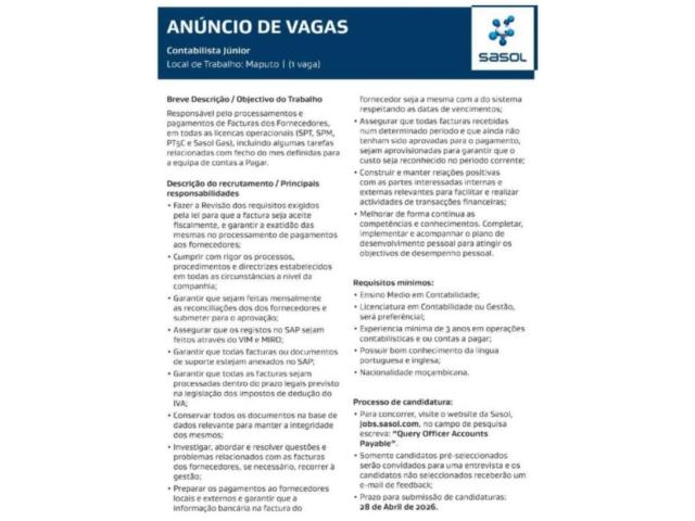 Vaga – Contabilista Júnior – Maputo